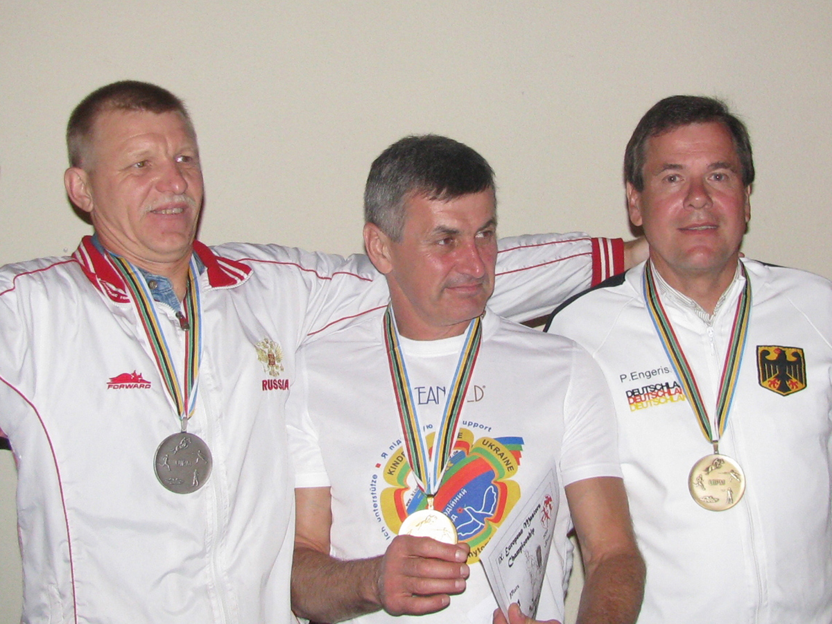 | Bei den Fünfkämpfern M50+ siegte Oleksandr Gospodynov aus der Ukraine (Mitte). Valeriy Filatov aus Russland (links) gewann Silber und Peter Engerisser vom SV Kronach (rechts) holte Bronze. |