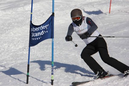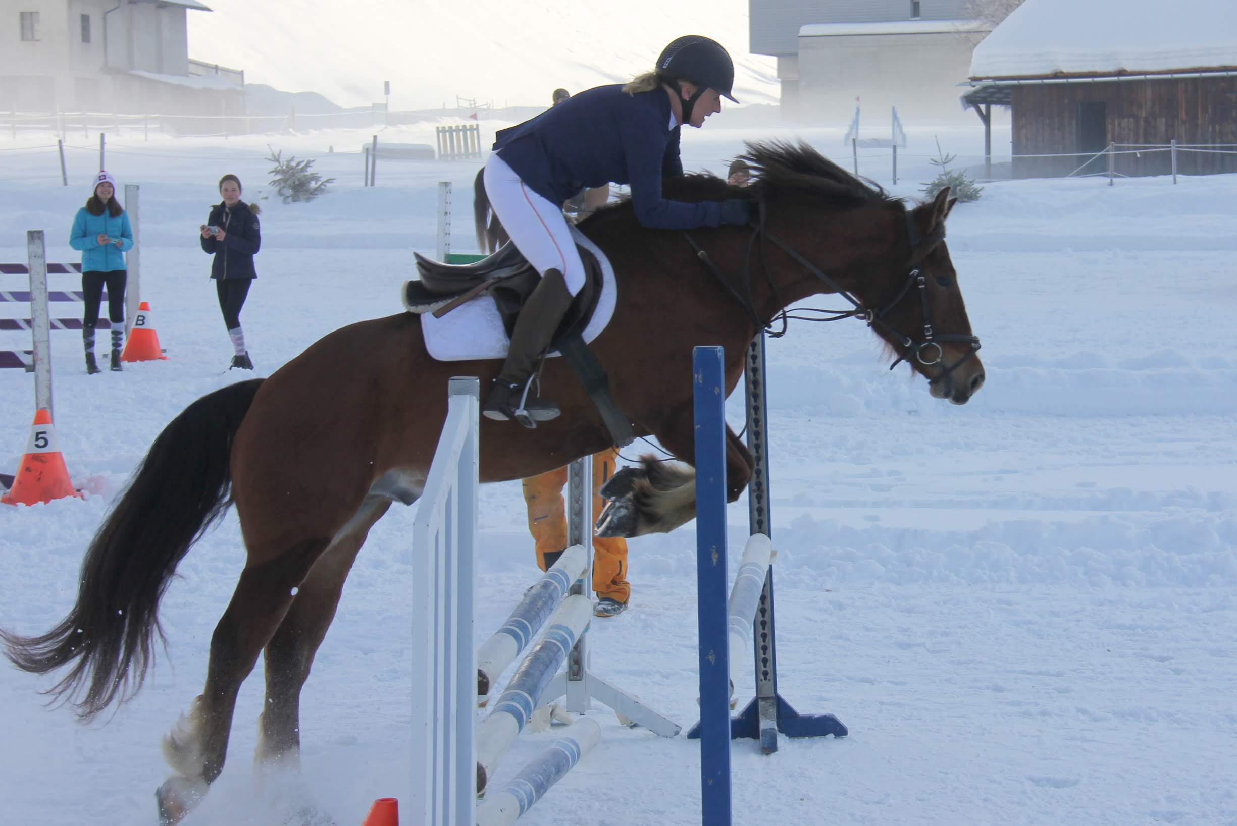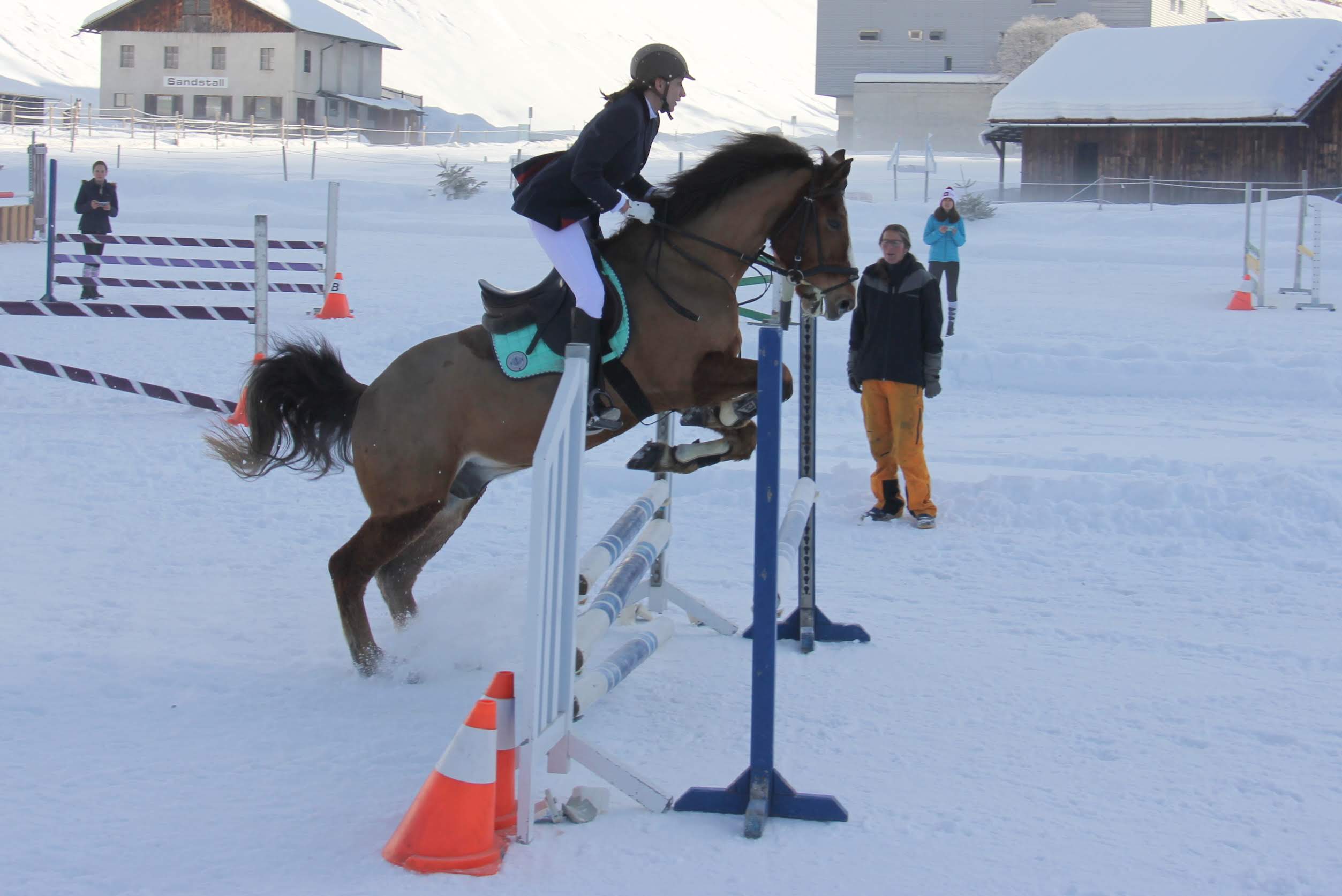 | Sie war nicht nur im Fechten Spitzenklasse: Beate Schenkel aus Halle zeigte auf dem winterlichen Springparcours stilistisch eine gewohnt souveräne Performance und wurde Zweite der Damenwertung. | Wie beim Riesenslalom, so auch beim Springreiten auf schneebedecktem Geläuf war die Hamburgerin Gesche Reimers ganz vorne mit dabei. | ||||||||||||||||||