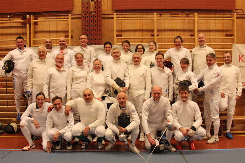 | Gruppenfoto beim Fechten: mehr als 30 Teilnehmer aus sechs Nationen stellten sich beim Davos Winter Pentathlon 2020 dem Wettbewerb auf der Planche. Darunter etliche Weltklassefechter aus der Ukraine. . |