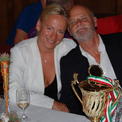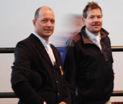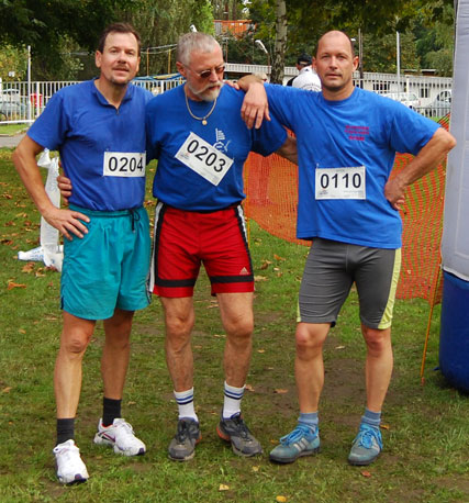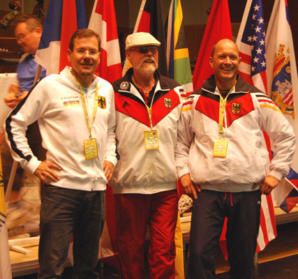 | ...und abends, verstärkt durch Rüdiger, bei der Siegerehrung. Links Roger Menck, Gewinner von Einzel-Bronze in der Klasse 60-69. Die bereits verliehene WM-Silbermedaille in der Mannschaftswertung musste allerdings wenig später aufgrund eines Einspruches der Mannschaft der Ukraine und nachfolgender Ergebniskorrektur der Jury wieder zurückgegeben werden... | |||||||||||||||||||||||||