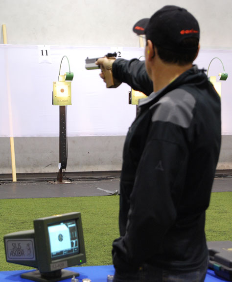 | Auf dem Schießstand waren als zweite Disziplin 20 Schuß mit der Luftpistole auf eine Entfernung von 10 m zu absolvieren. Die Veranstalter hatten dazu eine hochmoderne elektronische Scheibenanlage der Firma Sius installiert. Die Lichtverhältnisse waren allerdings ziemlich ungewöhnlich, weshalb mancher Schütze über sein Ergebnis etwas negativ überrascht war. | |||||||||||||||||||||||||