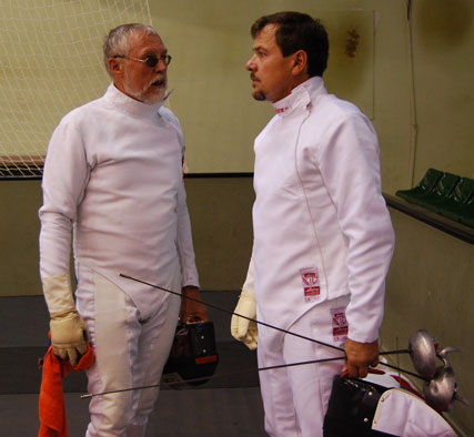 Kurze Lagebesprechung am nächsten Morgen mit Fechtmeister Roger Menck (li.) vor der vierten Disziplin, dem Fechten. | ||||||||||||||||||||||||