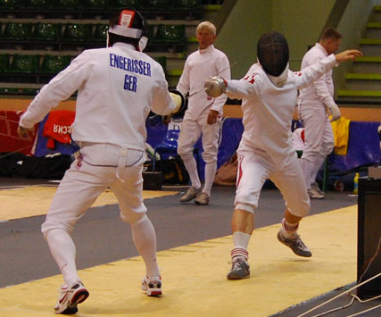 | Gefochten wurde mit dem Degen auf je einen Treffer im Modus Jeder gegen Jeden, wobei jedes gewonnene Gefecht 32 Punkte zählte. | |||||||||||||||||||||||||