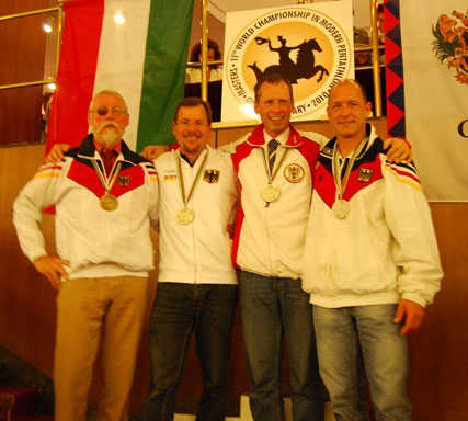 Vom 16. - 18. September 2010 fand im ungarischen Györ die XI. Masters Weltmeisterschaft im Modernen Fünfkampf sowie im Vierkampf statt. Auch eine deutsche Delegation war angereist, um sich mit den weltbesten Atlethen der Altersklassen ab Jahrgang 1981 zu messen. Vor allem aus den osteuropäischen Ländern, traditionell stark in dieser Sportart etabliert, waren zahlreiche Mannschaften mit leistungsstarken Wettkämpfern vertreten, was die Aussichten auf eine gute Platzierung für das deutsche Fünfkampf-Herrenteam erschwerte. Am Ende erreichte Roger Menck mit 4978 Punkten den hervorragenden dritten Platz in seiner Alterklasse und kam damit als einziger des deutschen Männertrios in die Medaillenränge. Peter Engerisser, durch eine Rückenverletzung gehandicapt, erreichte mit 5078 Punkten in der Einzelwertung einen zwar guten aber undankbaren 4. Platz. Manfred Häb wurde 10. mit 4924 Punkten. In der Fünfkampf-Mannschaftswertung stand das deutsche Herrenteam mit Engerisser, Häb und verstärkt durch Rüdiger Tesar bereits mit der WM-Silbermedaille auf dem Siegerpodest, wurde allerdings nachträglich durch eine Wertungskorrektur der Jury auf den 4. Platz zurückgestuft. Erfolgreicher als die Herren war das deutsche Team der Fünfkampffrauen mit dem Gewinn der Bronzemedaille für Gerlind Nagel, Beate Schenkel und Gesche Reimers in der Mannschaftswertung sowie der Silbermedaille von Stefanie Sauer in der Einzelwertung der Altersklasse 50-59. |