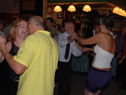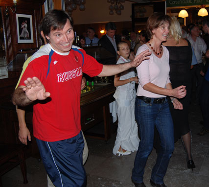 | ...legten andere eine flotte Sohle auf Parkett. Vor allem die Gäste aus Russland und der Ukraine waren in dieser Disziplin nicht zu bremsen. Sandra, die diesen Galaabend anstrengender als den Wettkampf fand, hatte sich schnell in die Besonderheiten der russischen Tanzweise eingefunden. Alles in allem ein schöner Ausklang. | |||||||||||||||||||||||||