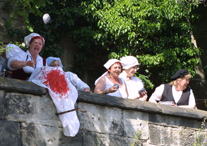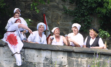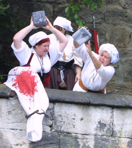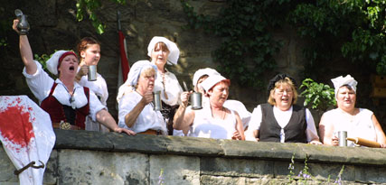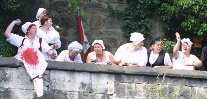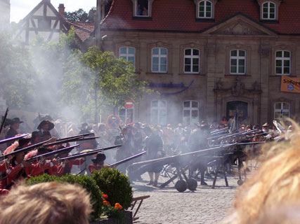 | Gerade ist der Viertelmeister "Murmann Andreesla" erschossen worden. Nun ist es vorbei mit der Zurückhaltung. Sein blutgetränktes Hemd stachelt die Kronacher Frauen zur äußersten Verteidigung an. Die ersten Steine fliegen. | ||||||||||||||