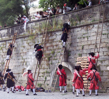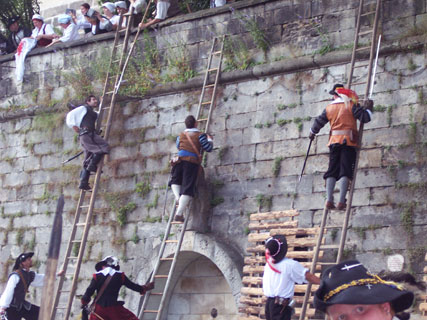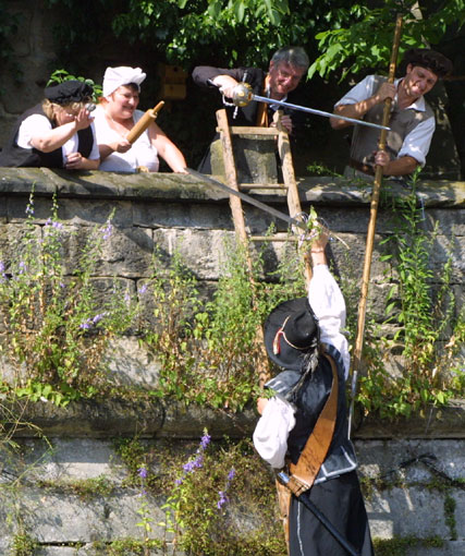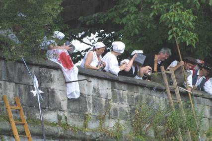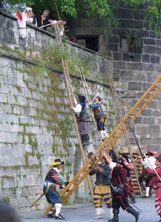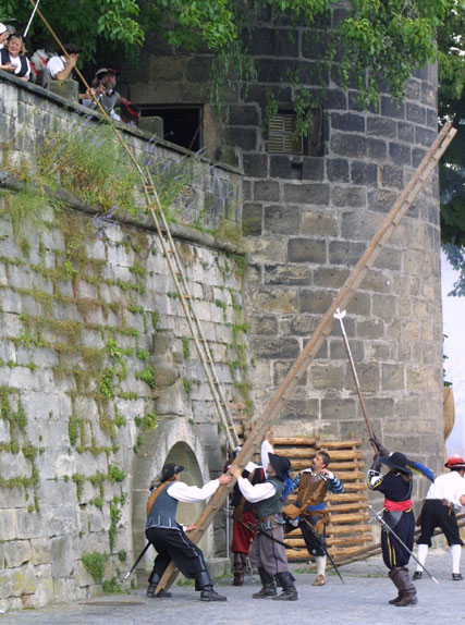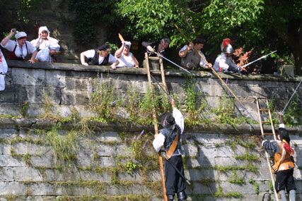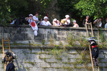 | Weitere Leitern kommen hinzu, auf denen die Angreifer versuchen, in den Zwinger zwischen Pfarrturm und Pfarrhaus zu steigen, um von dort aus über die St. Anna Kapelle in den oberen Kirchhof der Stadt zu gelangen. | ||||||||||||||