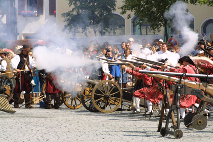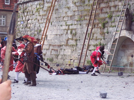 | Auf dem Marienplatz standen die Regimenter dicht gedrängt, "da man ihnen zwar vffm Pfarr-Saal mit Pflastersteinen, welche unser Weiber-Volk und Dienst-Mägd häuffig hinzu trugen, auch im unteren Brauhauß die Pfannen anschüren vnd heisses Wasser machen mußten, starck begegnetn auch hinauss vuffn Platz mit solchen Steinen unter die Völcker wurff, daß es viel blutige Köpff setzte." (O-Ton J. N. Zitter 1661). | ||||||||||||||