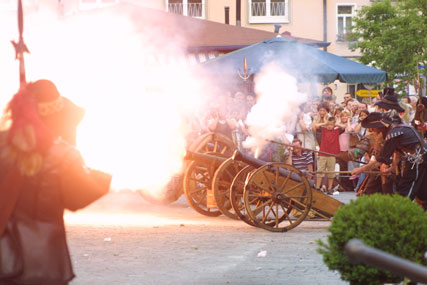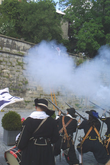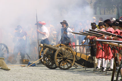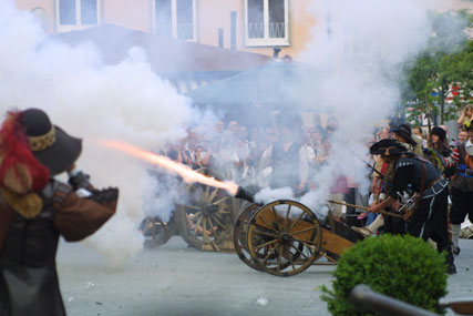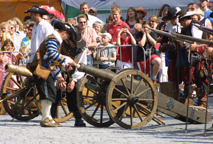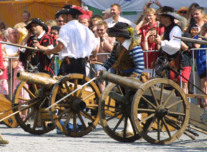 | Feuer! Mit gewaltigen Donner entlädt sich der "Hortus" 3-Pfünder, während Stefan Schultze von den "Landauern" gerade mit dem Luntenstock das etwas kleinere Stück des Bellicum Montanum zündet. Peter Engerisser im Vordergrund steht in einer etwas ungünstigen Trommelfell-Position. | ||||||||||||||