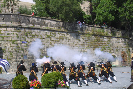 | Die Musketiere des Roten Regiments geben eine Salve in Richtung Mauerbrüstung ab, um die Kronacher am Ausbessern der Mauerbresche zu hindern. | ||||||||||||||